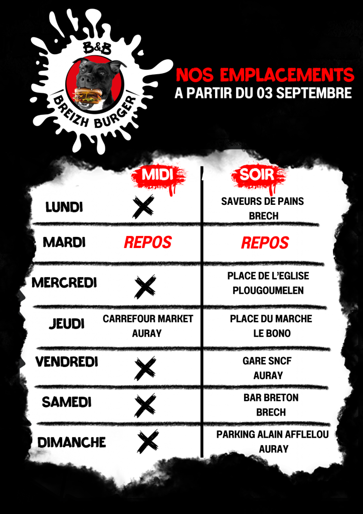 MENU 1/2 MENU 2/2 OU NOUS TROUVER ? bzhburger BREIZH BURGER 🍔🌭 Gault et Millau 2025-2026 🇫🇷 Food truck 🚐 Fabrication artisanale à base de produits locaux et frais ! ☎️ : 06.52.59.56.85 Un an de pure bonheur et de folie grâce à vous : BURGER DU MOMENT 🌿 « Bun’s artisanal, stea LE GUACA BREIZH ! 🥑 « Bun’s artisanal, eff NOTRE DESSERT DU MOIS ! 🍓 « Palet breton, cr NOUVEAU BURGER DU MOMENT ! ☀️ « Bun’s mai Burger l’Atlantique 🍔 « Saumon frais grill «La poire gourmande 🍐 Poire locale cuite dans BURGER DU MOMENT… Andouille Bretonne grillée Un peu de chaleur et de réconfort… En ce mome Notre première saison estivale ! Les marchés n LE BREIZH AND CHIPS 🐠 « Aiglefin croustillan Le CHORI’BREIZH ☀️ 1. Piperade de légumes Déjà deux semaines à parcourir le Morbihan et c Une viande de qualité c’est ce qu’il nous pla Bienvenue dans notre aventure BREIZH BURGER ! 🍔 Suivre sur Instagram
